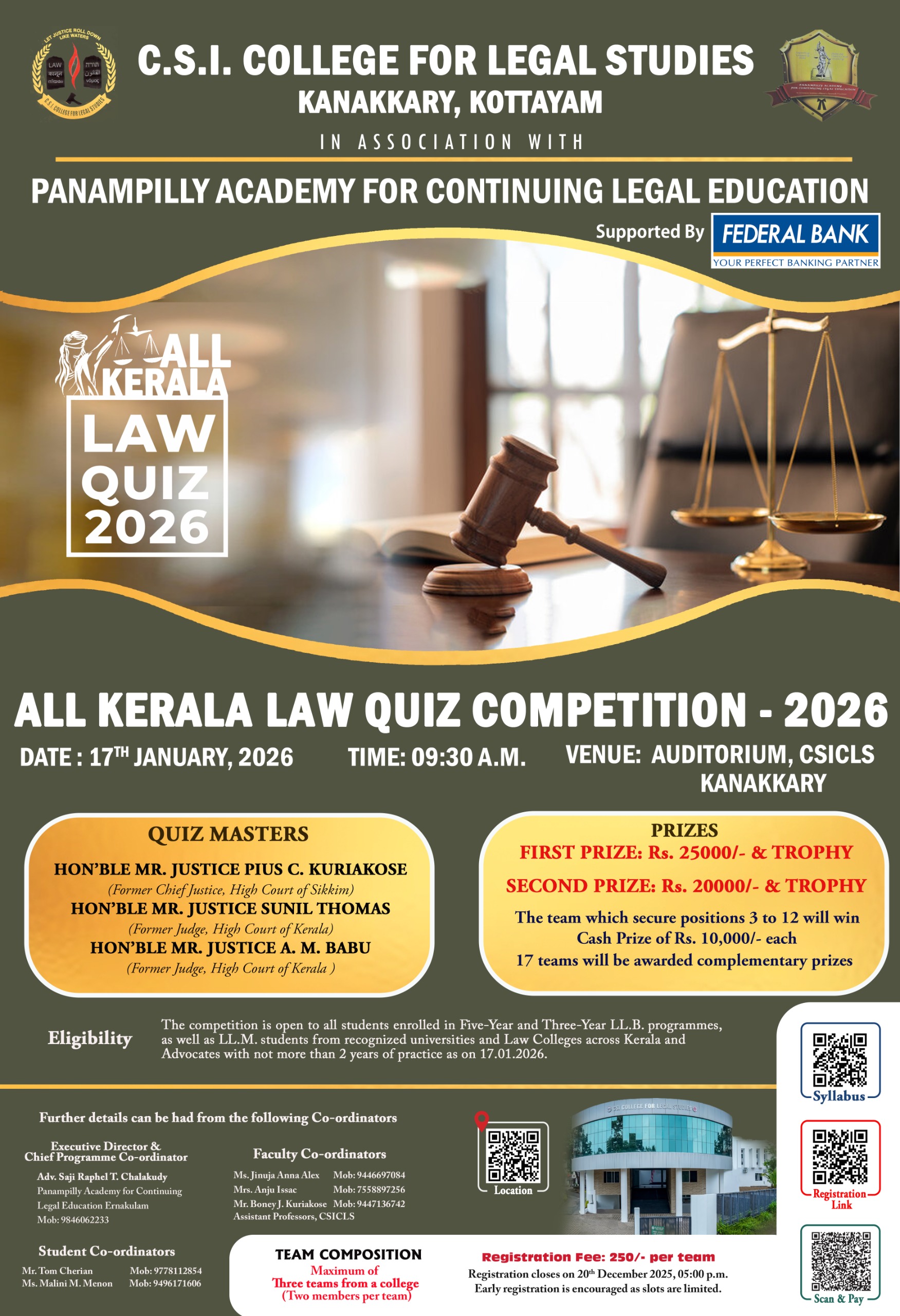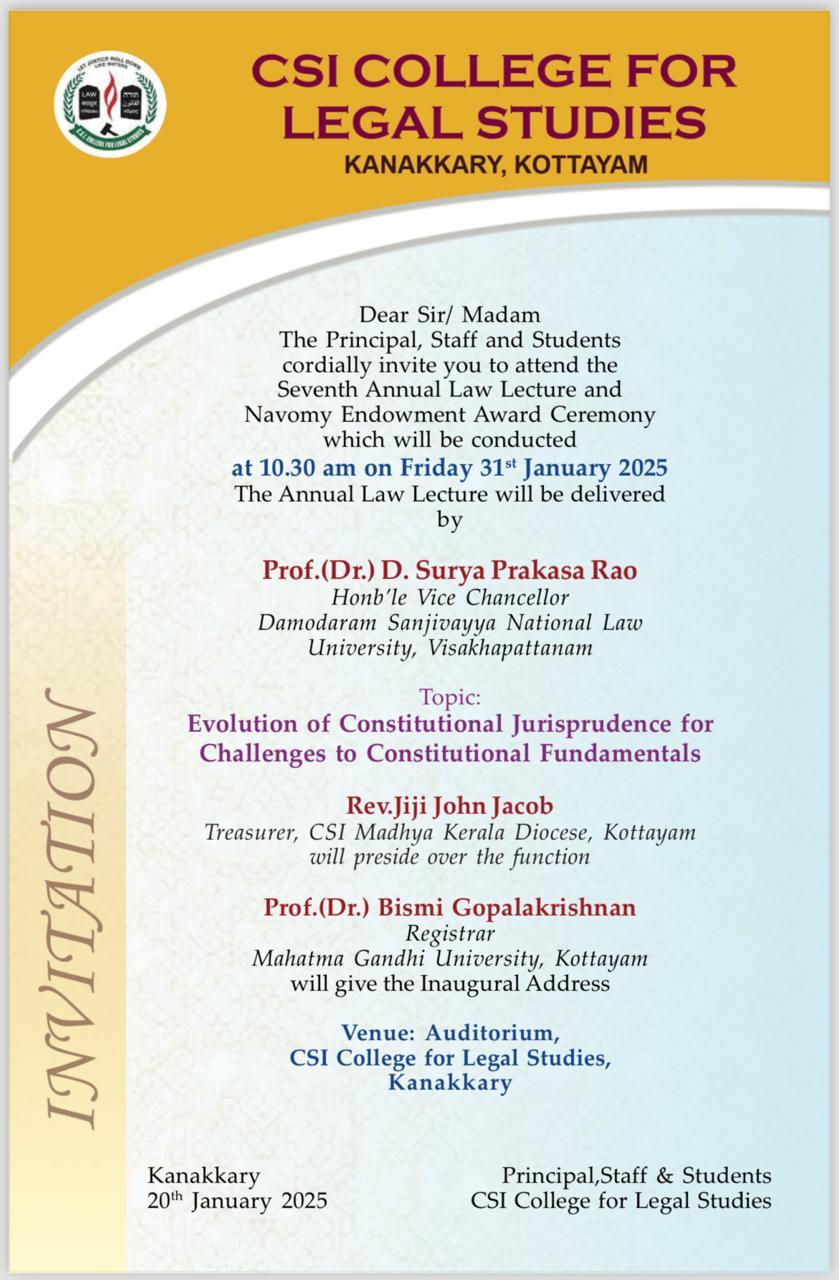 CSI College for Legal Studies, Kanakkary, Kottayam is a self-financing law college affiliated to Mahatma Gandhi University and approved by the Bar Council of India. Managed by the CSI Madhya Kerala Diocese—one of Kerala’s most respected educational agencies—the college offers quality legal education through undergraduate and postgraduate law programmes in an eco-friendly campus environment.